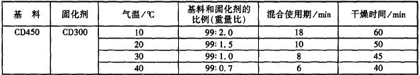 (一)預(yù)混:按比例將固化劑CD300加入基料CD450中.立即用電動(dòng)攪拌機(jī)低速攪拌均勻,混合比率、混合使用期及干燥時(shí)間隨溫度變化,溫度低時(shí)適量增加固化劑,溫度高時(shí)適量減少固化劑,參考數(shù)據(jù)如下表: