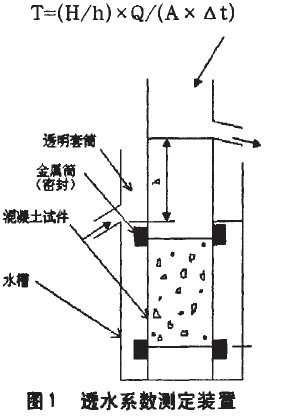 本研究的透水性能測試采用日本最近提出的《(固定水位透水測定法》來確定透水系數(shù)。其裝置如圖l所示。該裝置采用高度為H(mm),斷面積為A(mm2)的圓柱形試件,上部密封連接透明的圓柱形套筒,并在套筒的上部設一流出口。將其放入一個水槽中,水槽的上部設出水口。水槽出水口至套筒出水口之間的距離為水位差h。試驗前將試件充分飽水,將水槽中充滿水,直至水從出水口流出;從套筒上部不斷給水,使試件上部水位高度保持不變,測定從水槽出水口流出的水量Q(mm3)和出水時間At(s),則透水系數(shù)T按下式計算;