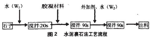 透水性混凝土拌和物中水泥漿稠度較大,且數(shù)量較少,為了保證水泥漿能夠均勻的包裹在集料上,宜采用強制式攪拌機,攪拌時間為2min~4min。其投料次序采用水泥裹石法,其工藝流程如圖2所示。采用這種方法,預拌水量(w.)為總用水量的8%~10%。這項技術要注意控制W.,W,太少石子預濕不完全,下一步加水泥拌和時,形成不了包裹石子表面的水泥漿殼,W.太多則形成的漿殼很稀,易被第二次加水攪拌時沖刷破壞,所以要控制好W,和兩次攪拌時間。