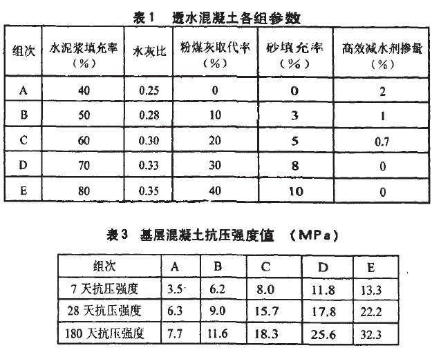 影響透水混凝土的技術性能的因素有透水方式、材料密度、原材料性能、配合比、成型方法和養(yǎng)護條件等:而對于透水混凝土來說,強度和透水性是對立的,在配合比設計時必須綜合考慮。表l列出了透水混凝土配合比設計中的各組參數(shù)。