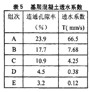 由表5可見,A—E組的連通孔隙率逐漸減小,同時透水系數(shù)也逐漸減小。這是因為透水性混凝土主要依賴于混凝土內部的連通孔隙來透水,所以連通孔隙率越大,透水系數(shù)越大,透水性也就越好。