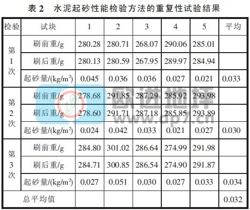 將P·C32.5 水泥, 按上述的起砂性能檢驗方法,反復(fù)試驗3 次,每次試驗5 個試塊,驗證上述檢驗方法的可靠性和檢驗結(jié)果的重復(fù)性。水泥起砂性能檢驗方法的重復(fù)性試驗結(jié)果見表2。由表2 可見,3 次檢驗結(jié)果的平均值誤差不大,重復(fù)性較好。