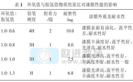 環(huán)氧值與胺氫值物質(zhì)的量比對(duì)漆膜性能的影響在影響水性環(huán)氧地坪涂料的諸多因素中,環(huán)氧脂與固化劑的配比最為重要,主要是指環(huán)氧值與胺氫值物質(zhì)的量比[5]??疾飙h(huán)氧值與胺氫值物質(zhì)的量比對(duì)漆膜性能的影響,試驗(yàn)結(jié)果見表
