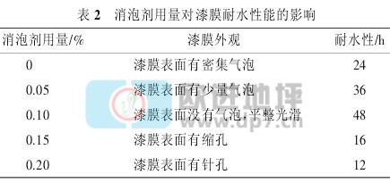 可知,隨著消泡劑用量的增加,漆膜表面出現(xiàn)有泡、無泡、縮孔等情況,而且其耐水性隨著消泡劑用量的增加出現(xiàn)先增后減的情況。當(dāng)消泡劑用量為 0.1%時(shí),漆膜外觀最好,而且耐水性也好,所以選擇的消泡劑最佳加入量為0.1%。