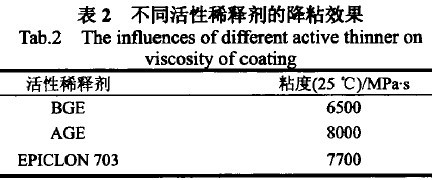 常用的活性稀釋劑主要有AGE、BGE,它們均為低分子質(zhì)量環(huán)氧化合物,較易揮發(fā)、氣味濃、毒性較大,不符合日益增長的環(huán)保要求。EPICLON 703為C12.C14烷基縮水甘油醚,沸點高達107℃,不易揮發(fā),極低的氣味,毒性低,具有優(yōu)異的顏填料潤濕能力,是一種環(huán)保型環(huán)氧活性稀釋劑。不同的活性稀釋劑對漆料的降粘效果不一樣。保持其它條件不變,分別采用BGE、AGE和EPIcLON 703制漆,測定它們的粘度,以觀察不同活性稀釋劑的降粘效果。粘度測試結(jié)果見表2。