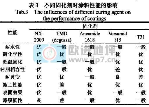 環(huán)氧樹脂本身是一種熱塑性高分子,單純的環(huán)氧樹脂本身并沒有多大的價值,只有加入固化劑使它轉(zhuǎn)變?yōu)槿S網(wǎng)狀立體結(jié)構(gòu),才能呈現(xiàn)其優(yōu)異的性能。目前無溶劑自流平地坪涂料使用的主要固化劑有脂肪胺及其加成物、脂環(huán)胺及其加成物、聚酰胺及其加成物、酚醛胺等。通常選用的固化劑中應該含有抗白花、耐酸、低溫固化(5~10℃)、耐黃變、抗水斑的成分,以避免無溶劑環(huán)氧自流平地坪涂料在低溫、高濕的環(huán)境下施工可能出現(xiàn)的油斑和白花現(xiàn)象,因此固化劑的選擇至關(guān)重要。試驗中采用了五種固化劑,分別與同一色漆搭配制備涂膜,觀察了它們對涂膜性能的影響,結(jié)果見表3。
