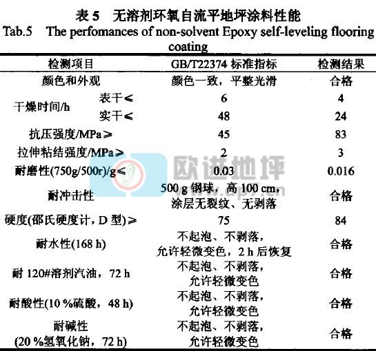 按照優(yōu)化后的配方,采用環(huán)保型活性稀釋劑EPICLON 703制備無溶劑環(huán)氧自流平地坪涂料,并按國標方法檢測其各項性能,多次重復試驗的測試結(jié)果重現(xiàn)性好,所制備涂料的各項性能達到或高于國標規(guī)定的指標,檢測結(jié)果見表5。