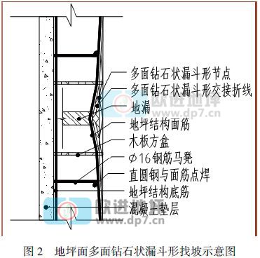 3.3.4 為確保多面鉆石狀漏斗成型,地坪結(jié)構(gòu)面筋節(jié)點下布設一根ф16 圓鋼直馬凳,按該節(jié)點標高下35mm 為面筋頂面,確保保護層的統(tǒng)一。