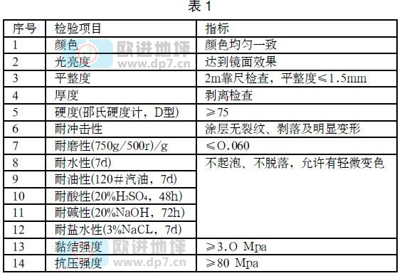 環(huán)氧地坪必須符合《中華人民共和國化工行業(yè)標(biāo)準(zhǔn)》(HG/T3829-2006)的技術(shù)要求。施工完成后,應(yīng)對成品進(jìn)行質(zhì)量檢測,各項(xiàng)檢測應(yīng)合格。檢測項(xiàng)目及要求見表1。