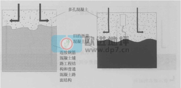 這種路面(右上圖)屬于排水型路面結(jié)構(gòu),結(jié)構(gòu)的承載能力由下層的瀝青混凝土層和上層5cm--10cm的多孔混凝土層為一體的結(jié)構(gòu)來承載。這種路面結(jié)構(gòu)可以作為鋪筑新的混凝土結(jié)構(gòu)層,也可以用做舊的混凝土路面的修繕工程。