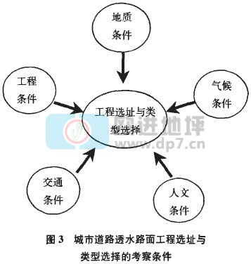 歐美等國家城市道路透水性路面設計主要包括5步:工程選址與評估一透水鋪裝材料選用與評估一透水路面結構設計分析一透水路面施工與質量控制一透水路面成效評估.其中,工程選址與評估為首要步驟,與透水路面選型密切相關,兩者共同決定透水路面工程的可行性、適用性、實用性、經濟性;但具體操作方法不盡相同,美國偏重試驗法,日本采用試驗一經驗法,我國臺灣則采用人文、水文、地文調查法,綜合上述各方法優(yōu)點,結合我國實際,本研究認為我國在進行城市道路透水路面建設工程選址與類型選擇時,可在常規(guī)工程選址調查的基礎上,綜合考察圖所示的地質、氣候、人文,交通、工程等5方面條件,做出合理決策。