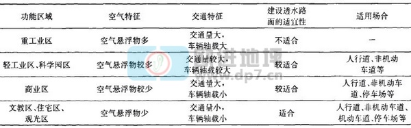 人文條件為透水地坪路面使用的人文環(huán)境.城市按區(qū)域功能的不同可分為工業(yè)區(qū)、商業(yè)區(qū)、文教區(qū)、住宅區(qū)、觀光區(qū)等,不同功能區(qū)的空氣環(huán)境不同.由下表可知,透水路面對使用環(huán)境中空氣質(zhì)量的要求很高,一旦孔隙阻塞,維護(hù)、維修較困難.因此,本研究認(rèn)為,我國在進(jìn)行透水路面工程選址時,應(yīng)充分考慮人文條件,將透水路面建在適宜的地區(qū)一重工業(yè)區(qū)空氣懸浮物多,易阻塞面層孔隙,故不宜建透水路面;透水路面最宜建在空氣質(zhì)量與環(huán)境衛(wèi)生較好的文教區(qū)、住宅區(qū)和觀光區(qū).城市各功能區(qū)域空氣特征及建設(shè)透水路面的適宜程度列于下表。