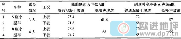 為了確定低噪聲坡道的實(shí)際降噪效果,對(duì)具有相同坡度的普通水泥坡道和低噪聲坡道處噪聲進(jìn)行了對(duì)比測(cè)試。小型轎車從車庫(kù)出入口中心線正上方通過(guò),模擬車輛在坡道上行駛。汽車門窗緊閉,檔位為1擋,保持車速約為5-10km/h。設(shè)置兩處采樣點(diǎn):一處為輪胎外側(cè),普通混凝土坡道上的采樣點(diǎn)距車身外側(cè)邊線0.6-1.0m,低噪聲坡道上的采樣點(diǎn)距車身外側(cè)邊線0.3-0.5m,兩者均高出路面15cm;另一處為副駕駛室座上方。用VS302USB雙通道聲信號(hào)分析儀進(jìn)行噪聲采樣,并計(jì)算各種情況下采樣噪聲的總A聲級(jí)。低噪聲坡道與普通混凝土坡道噪聲對(duì)比測(cè)試結(jié)果見(jiàn)表1。由表1可知,與普通水泥坡道相比,當(dāng)車內(nèi)乘員為3~4人時(shí),上坡?tīng)顟B(tài)下低噪聲坡道上輪胎外側(cè)測(cè)點(diǎn)降噪量超過(guò)8.sdB,下坡?tīng)顟B(tài)下的降噪量超過(guò)6.sdB。上坡?tīng)顟B(tài)下駕駛室內(nèi)測(cè)點(diǎn)降噪量為15dB,下坡?tīng)顟B(tài)下的降噪量為gdB。