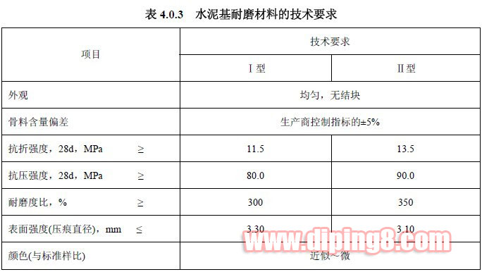 水泥基耐磨材料的骨料含量應(yīng)在質(zhì)保書(shū)中明示,其性能指標(biāo)應(yīng)符合表 4.0.3 的規(guī)定。