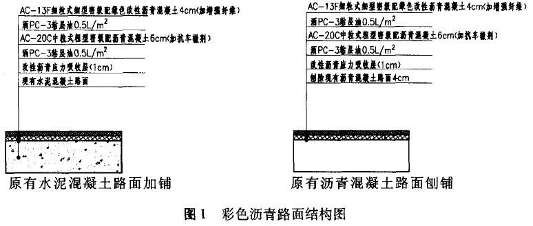 隨著“公交優(yōu)先”發(fā)展戰(zhàn)略的持續(xù)推進(jìn),彩色瀝青在我國的應(yīng)用已從單純的景觀鋪裝進(jìn)入可以起到強(qiáng)烈的區(qū)劃、警示作用的“公交優(yōu)先車道”階段。廣州首次在中山大道公交系統(tǒng)(BRT)試驗線工程中采用了綠色瀝青公交專用道,設(shè)計路面結(jié)構(gòu)形式為:原有水泥混凝土路面加鋪兩層瀝青面層、原有瀝青混凝土路面先刨除4cm瀝青混凝土再加鋪兩層瀝青面層,如圖所示。上面層彩色瀝青為AC一13F細(xì)粒式細(xì)型密級配綠色改性瀝青混凝土(加增強(qiáng)纖維)。