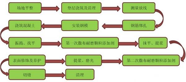 某煙草生產(chǎn)基地的建筑物包括建筑面積約9700m2 的實驗工房,建筑面積約711m2 的香料庫兩棟單體單層建筑和占地面積約2592m2、建筑面積約7200m2 的香糖料調(diào)配中心的單體三層建筑。本工程的技術(shù)難點主要有:廠房處于河道范圍,土質(zhì)穩(wěn)定性差;地面基土沉降不均勻,裂縫控制難度較大。原設(shè)計地面做法:1 5 0mm厚C1 5 混凝土墊層;8 0 m m 厚C 2 0 細(xì)石混凝土;2 0 mm 厚水泥砂漿。本工程室內(nèi)土為回填土,土質(zhì)較差,原圖紙關(guān)于室內(nèi)地面設(shè)計做法未考慮土質(zhì)的情況,且工藝上分二次施工,不利于保證地面的質(zhì)量。針對工程特點和生產(chǎn)需要,制定出大面積承重金剛砂耐磨地坪施工工藝,地面耐磨面料以水泥和復(fù)合增強外加劑為膠結(jié)材料,用人造燒結(jié)礦物及天然硬度礦物組合耐磨料拌合成。該煙草生產(chǎn)基地混凝土地面采用金剛砂耐磨地坪,具有表面硬度高、密度大、耐磨、不生灰塵、不易剝離等特點,通過對該項目金剛砂耐磨地坪采用合適的施工工藝和技術(shù),取得了良好的效果。