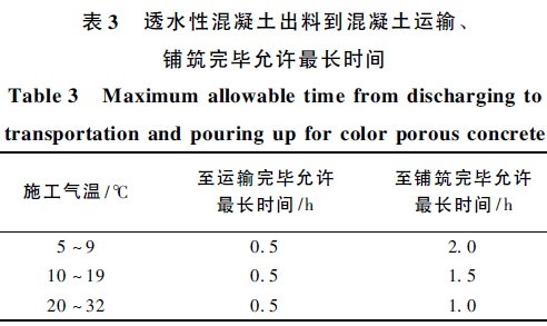 3) 透水混凝土拌合物運(yùn)輸時(shí)要防止振動(dòng)造成離析,應(yīng)注意保持拌合物的濕度,必要時(shí)采取遮蓋等措施。透水混凝土拌合物從攪拌機(jī)出料后,運(yùn)至施工地點(diǎn)進(jìn)行攤鋪、壓實(shí)直至澆筑完畢的允許最長(zhǎng)時(shí)間應(yīng)根據(jù)混凝土初凝時(shí)間及施工氣溫確定,并應(yīng)符合表3 的規(guī)定。